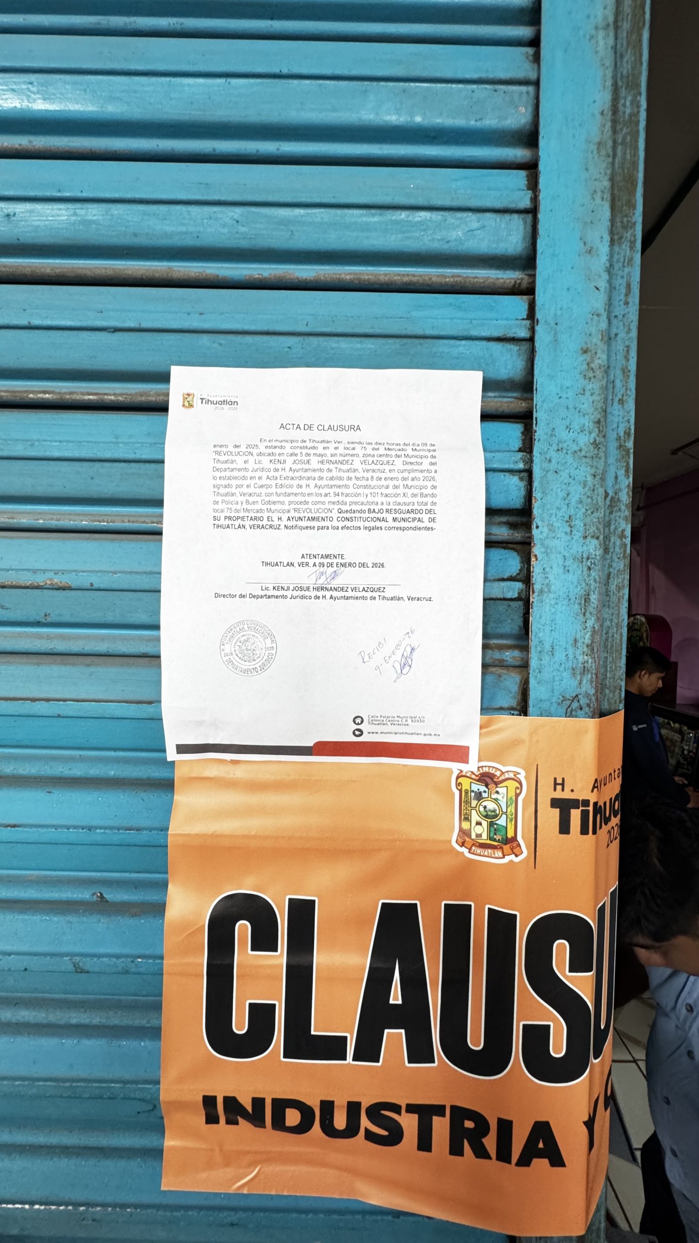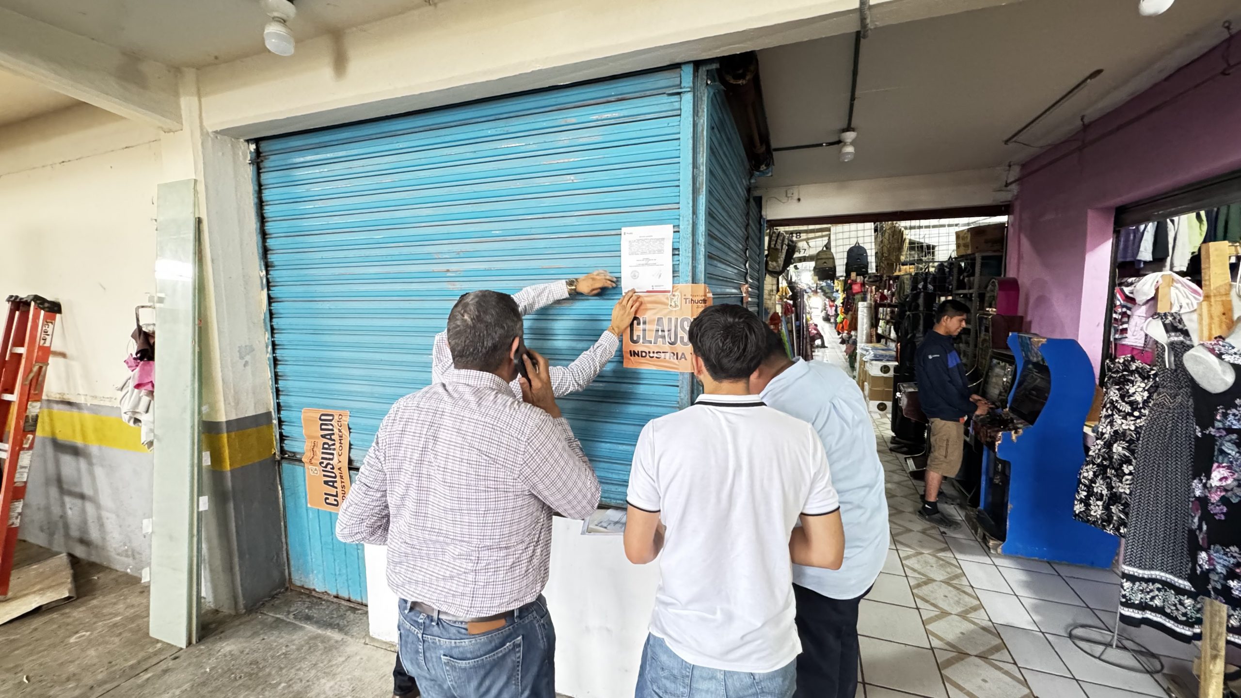Este viernes 9 de enero, el personal de Industria y Comercio, acompañados por elementos de la Policía Municipal (PMP), procedieron a colocar los sellos de clausura en un local número 75, dedicado a la venta de electrodomésticos, y las siguientas numeraciones son 98, 99 y 100, estos últimos tres inmuebles fueron construidos el año pasado por Leobardo Gómez, y después, asignados presuntamente a sus familiares.